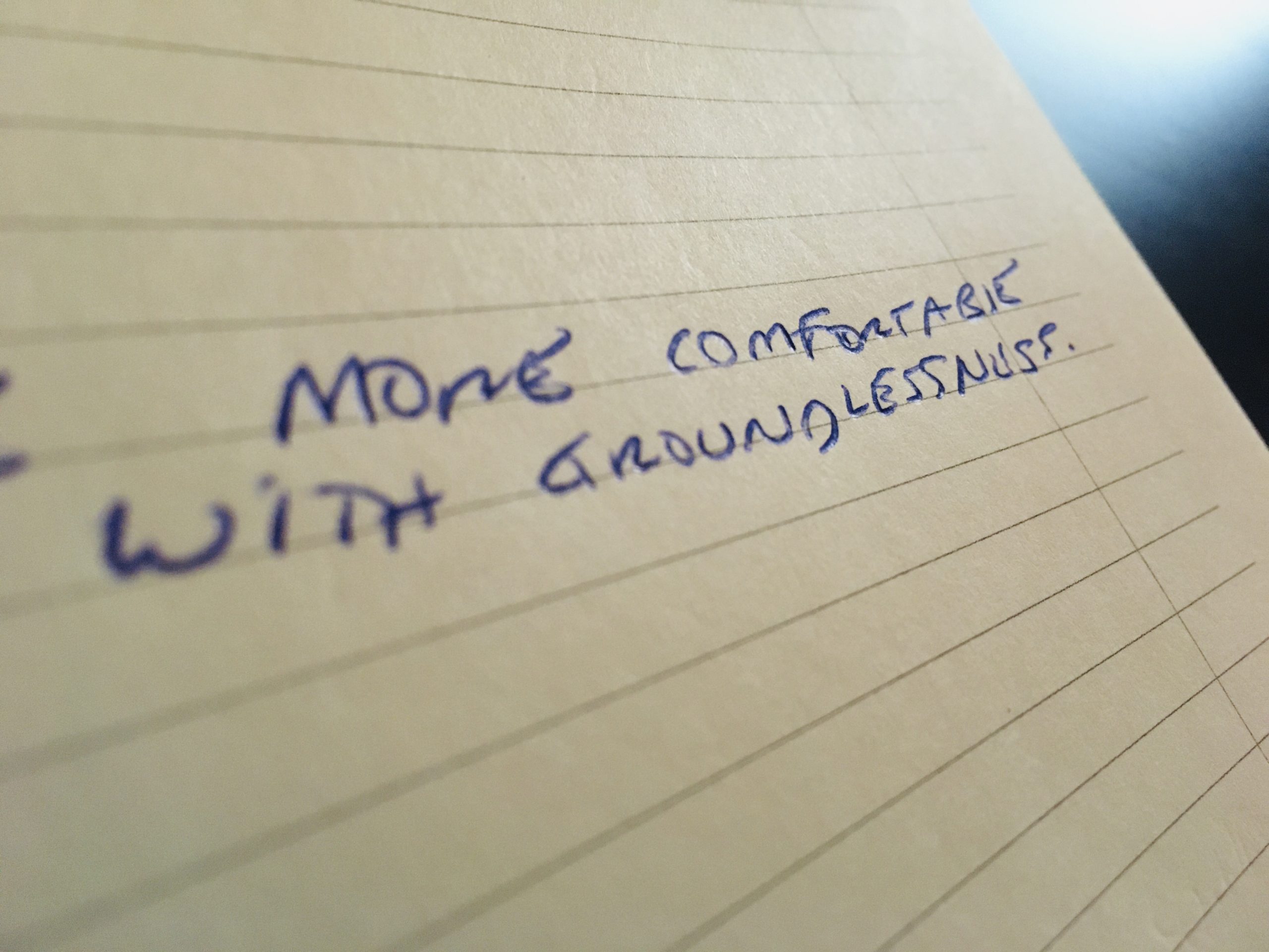 I began this year with a plan. My “start creating” trainer friend talked me into getting one of those hard-bound yearly planners. Goals and action points and that sort of thing. On the very first page I listed a goal of mediating every day for 20 minutes (a goal I’ve kept). Half way down the page the planner asks for reasons why this goal is important. In my messy block printing I wrote “To become more comfortable with groundlessness.” It’s a reference to the Buddhist teaching that all things are impermanent (even suffering). Change is the constant story of nature. Beginnings and endings and every new beginning comes from some other beginning’s end. (Closing Time by Semisonic). The more we struggle with change, the more we suffer. The more we connect with compassion for ourselves and others, the less we suffer.
